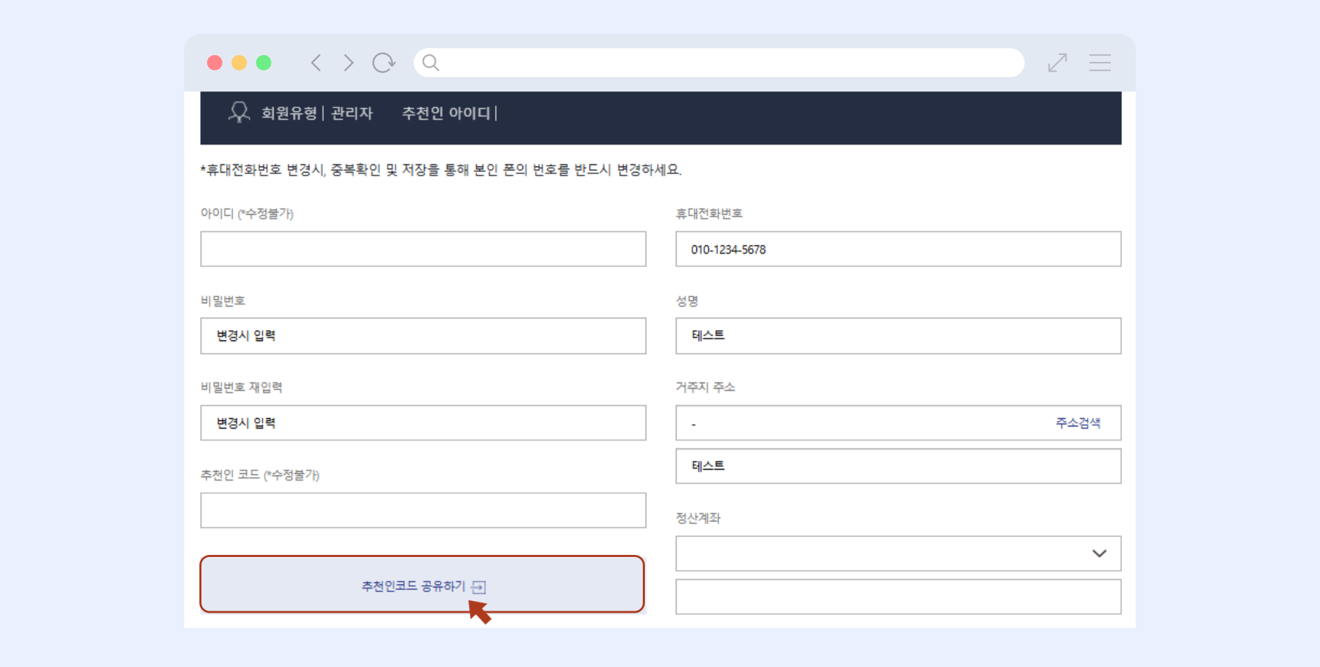 고객에게 나의 추천인코드를 링크 형태로 공유하여 쉽게 가입할 수 있도록 도울 수 있어요. 공유한 링크에는 링크를 발행한 사람의 추천인코드가 자동으로 기입 되어 몇가지 추가 정보만 기입하면 가입이 완료되어요.