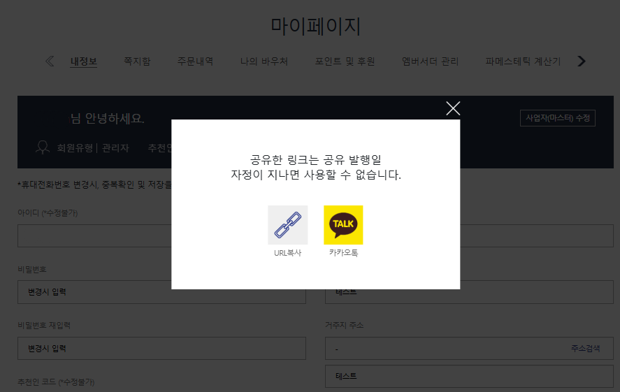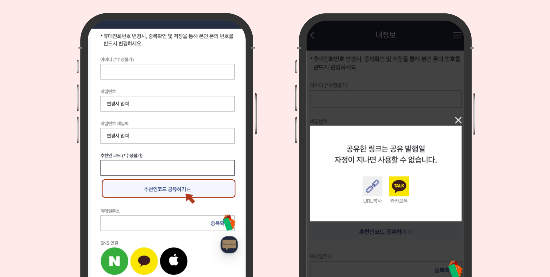 추천인코드 공유하기창은 URL 복사또는 카카오톡으로 공유할 수 있어요. 링크는 발행 당일 자정 자정까지만 유효하며, 자정 이후에는 링크를 다시 발행하여 사용해주셔야 합니다.